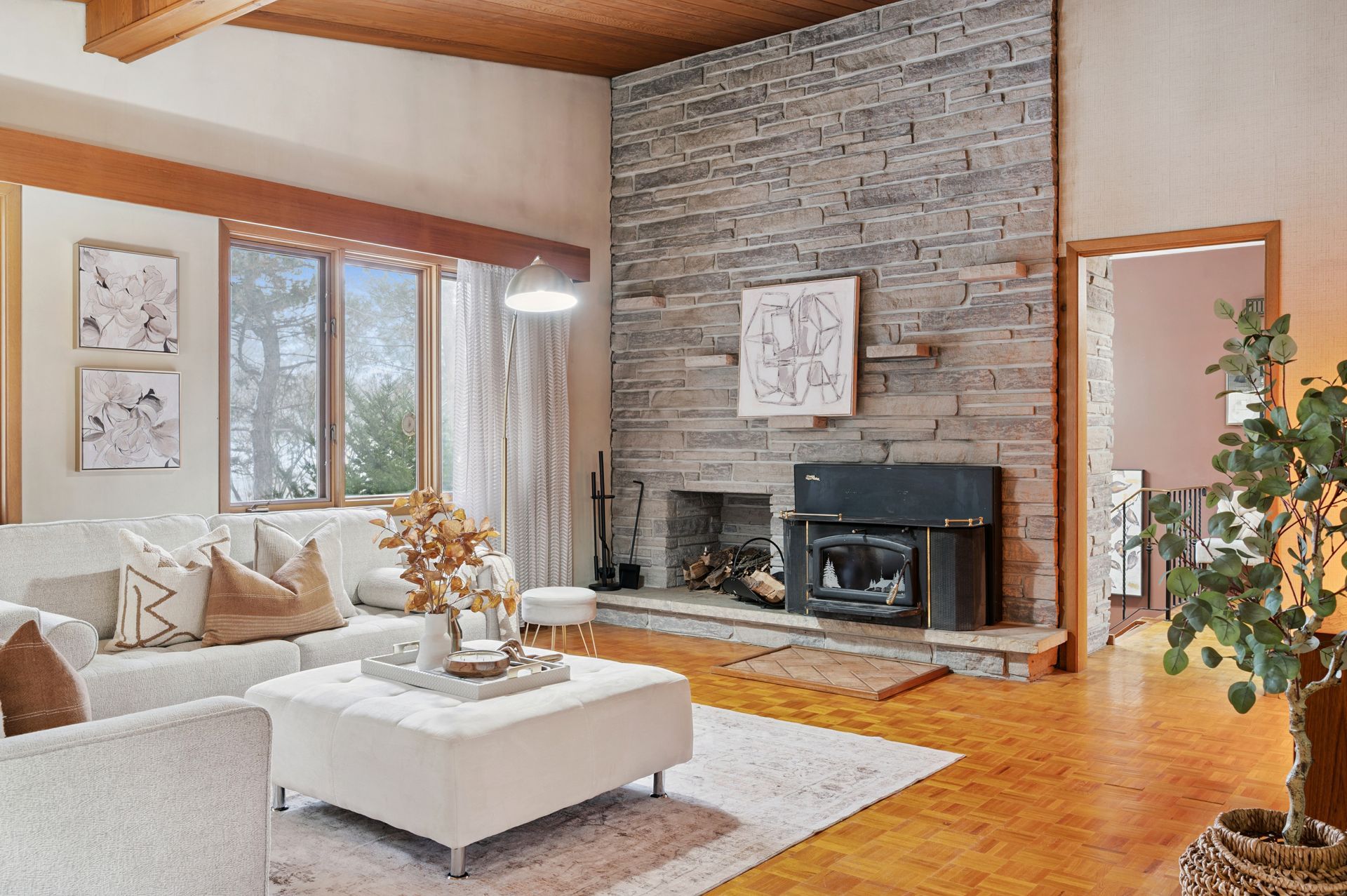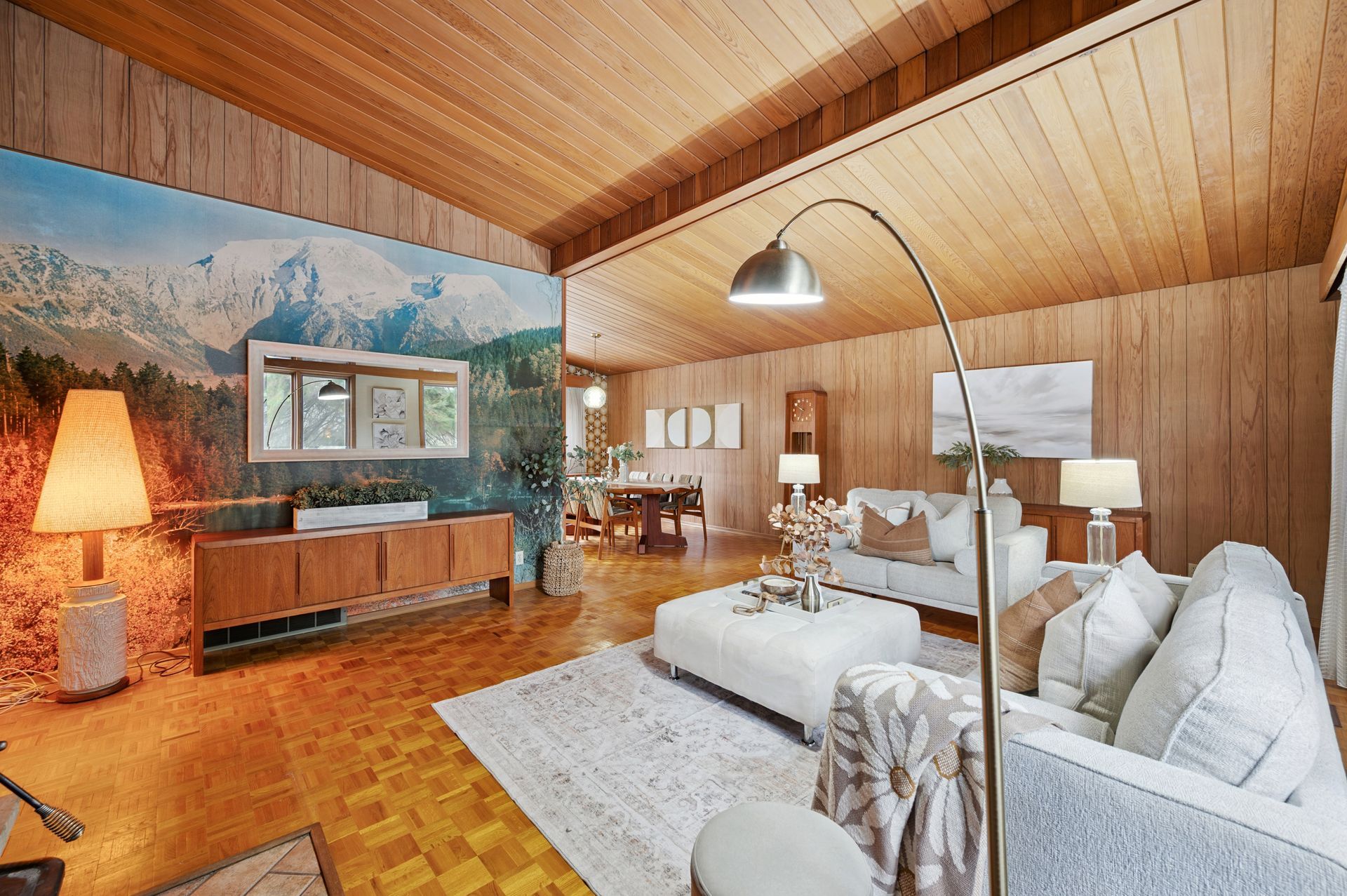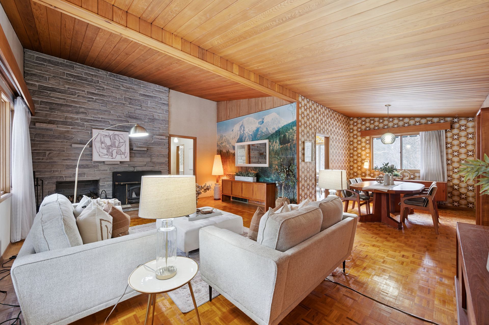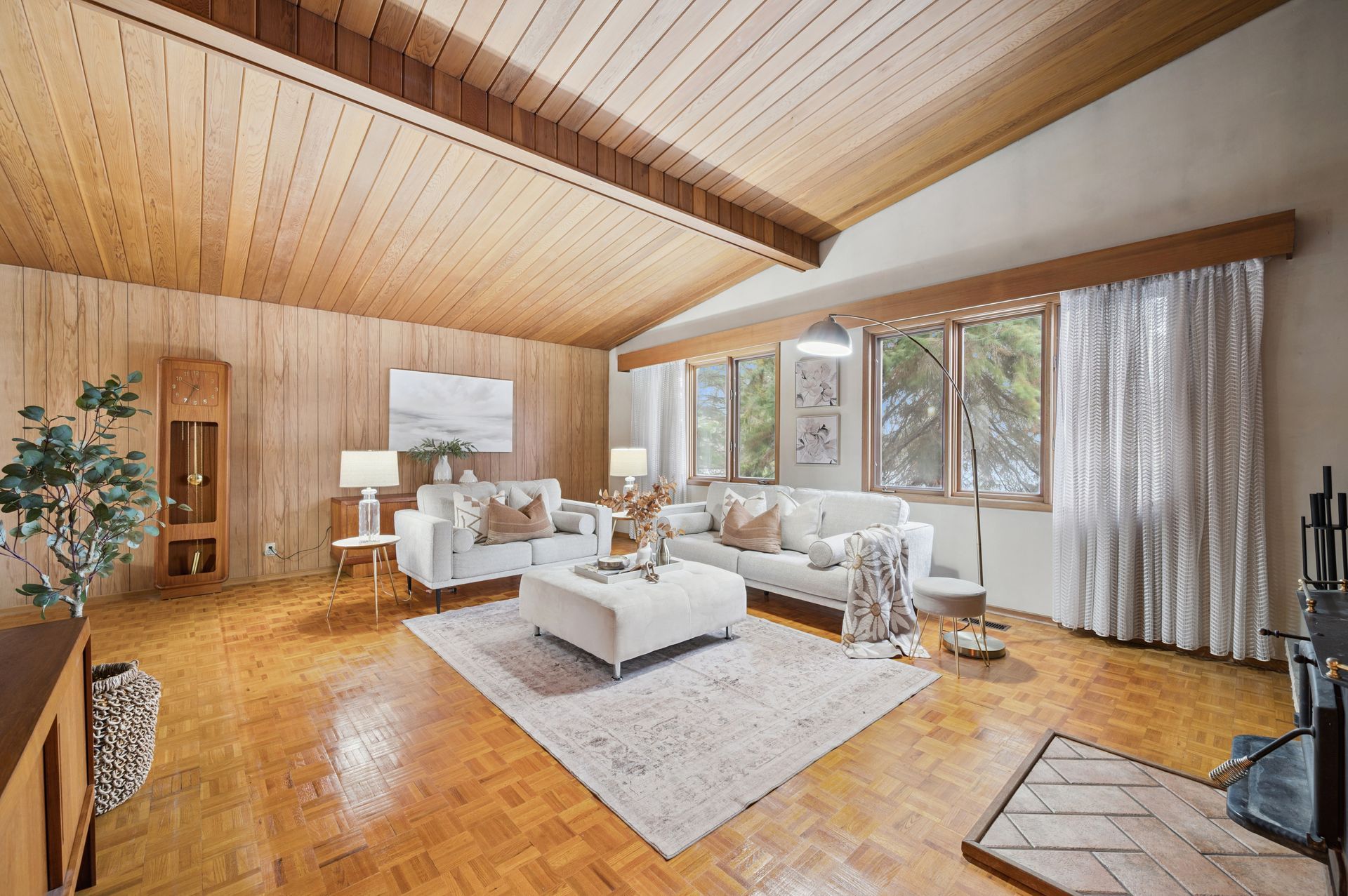 Step inside and instantly feel the warmth of this unique home, where soaring wood cathedral ceilings create dramatic lines and a striking sense of space in both the living and dining rooms. A stunning stone feature fireplace anchors the main floor, adding a timeless focal point that beautifully blends classic 70’s style with a cozy, inviting atmosphere. The carpet-free layout highlights natural textures and original architectural details, allowing the home’s vintage appeal to shine. With large, open rooms and endless styling potential, this is a space equally suited for modern updates or a full retro revival.