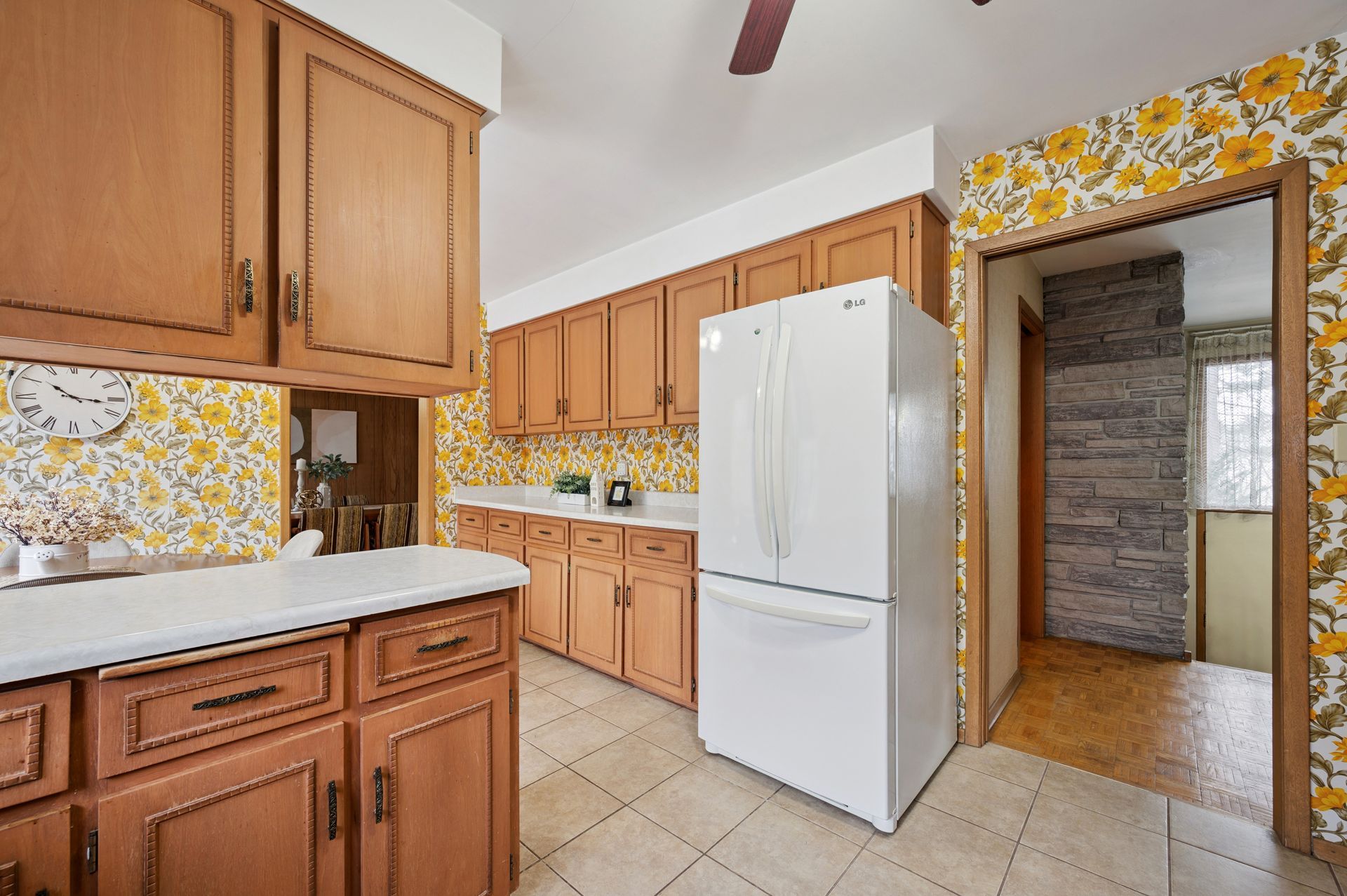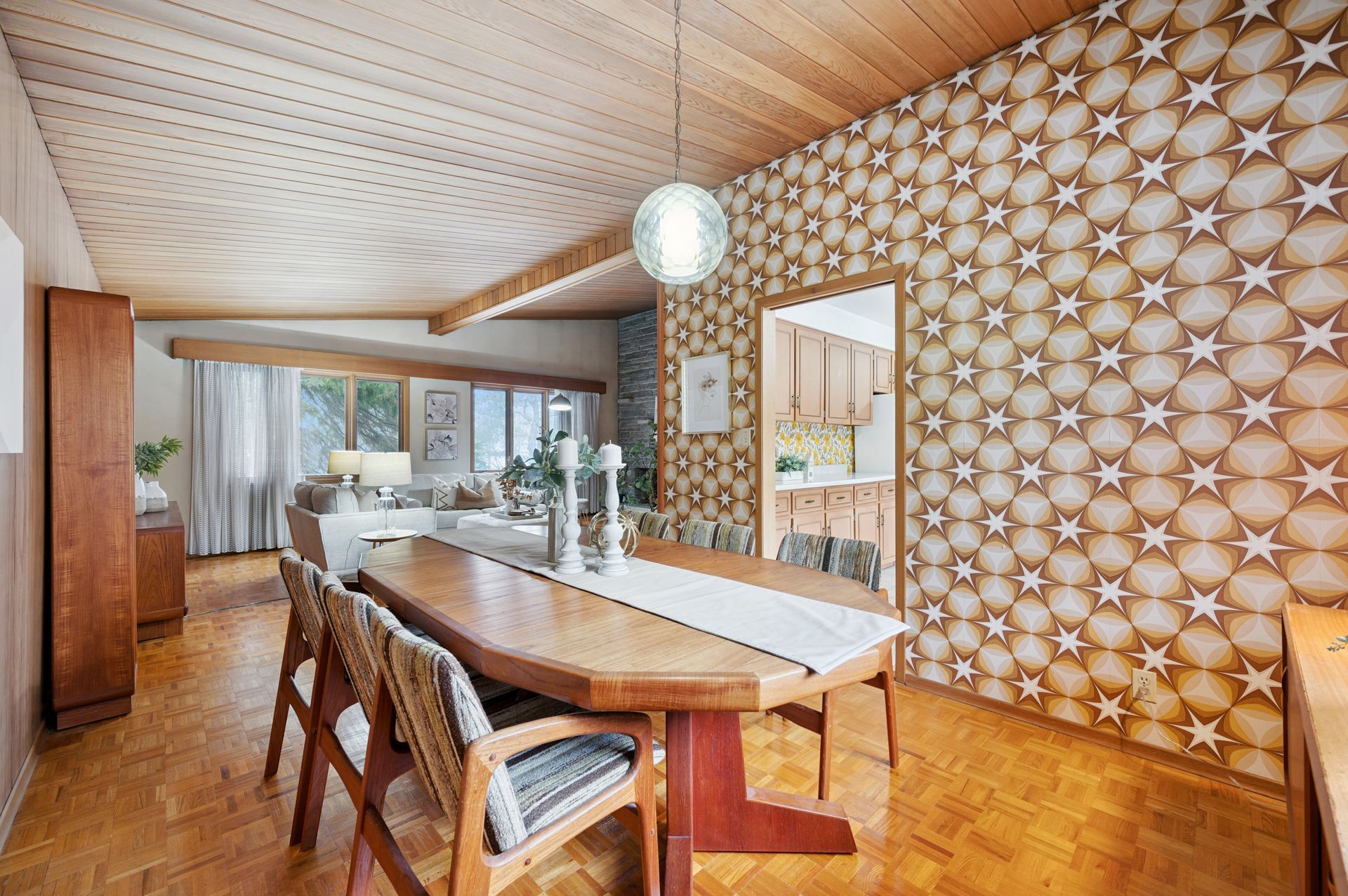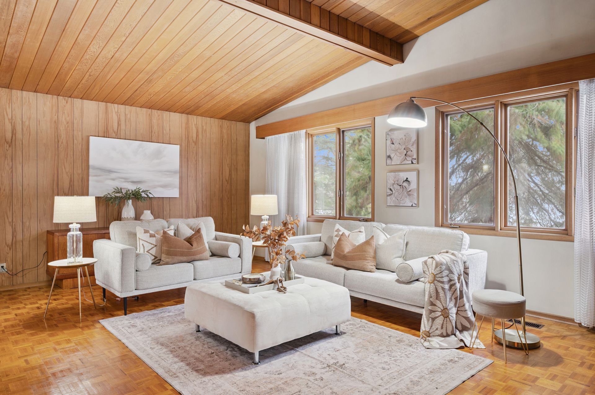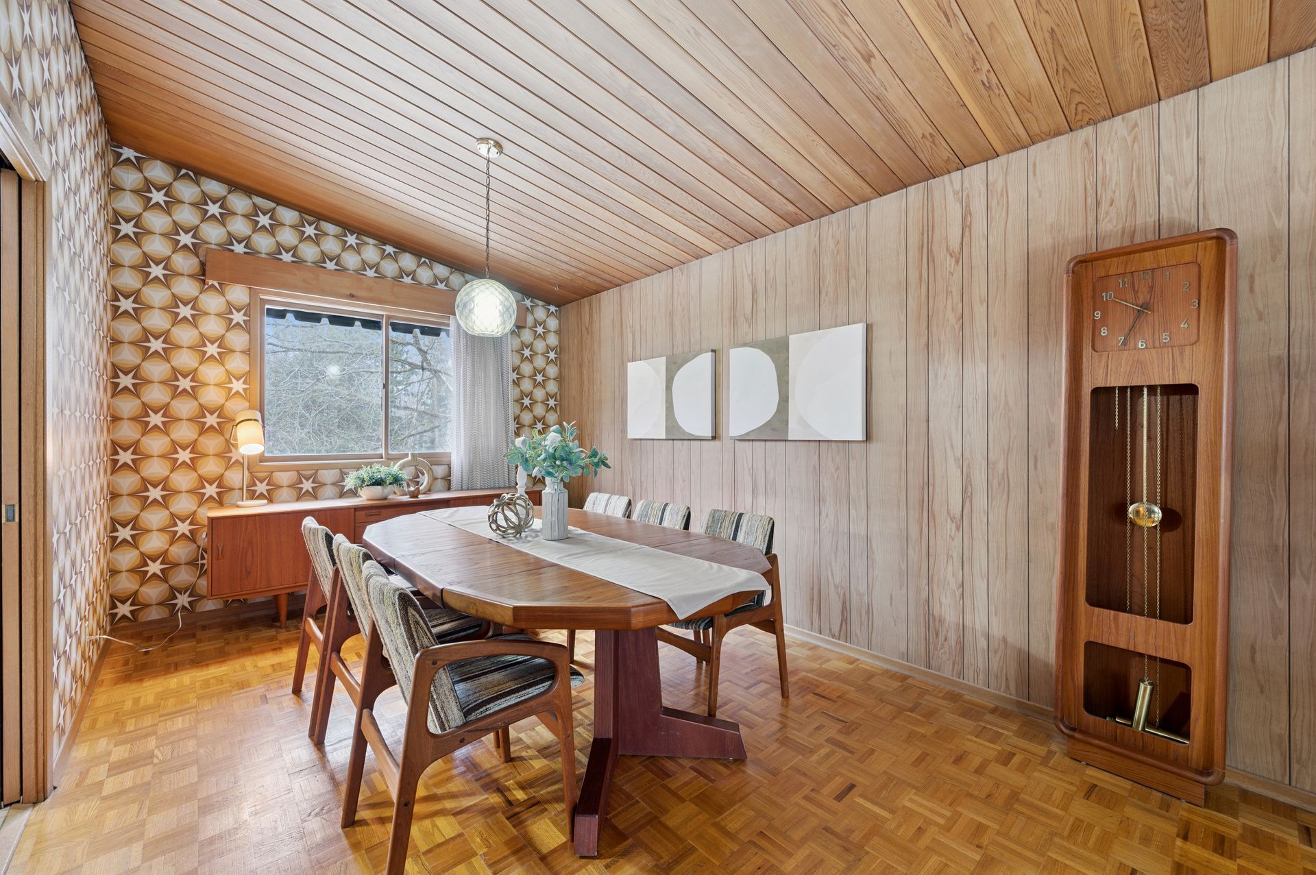 Step inside and instantly feel the warmth of this unique home, where soaring wood cathedral ceilings create dramatic lines and a striking sense of space in both the living and dining rooms. A stunning stone feature fireplace anchors the main floor, adding a timeless focal point that beautifully blends classic 70’s style with a cozy, inviting atmosphere. The carpet-free layout highlights natural textures and original architectural details, allowing the home’s vintage appeal to shine. With large, open rooms and endless styling potential, this is a space equally suited for modern updates or a full retro revival.